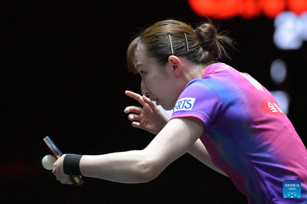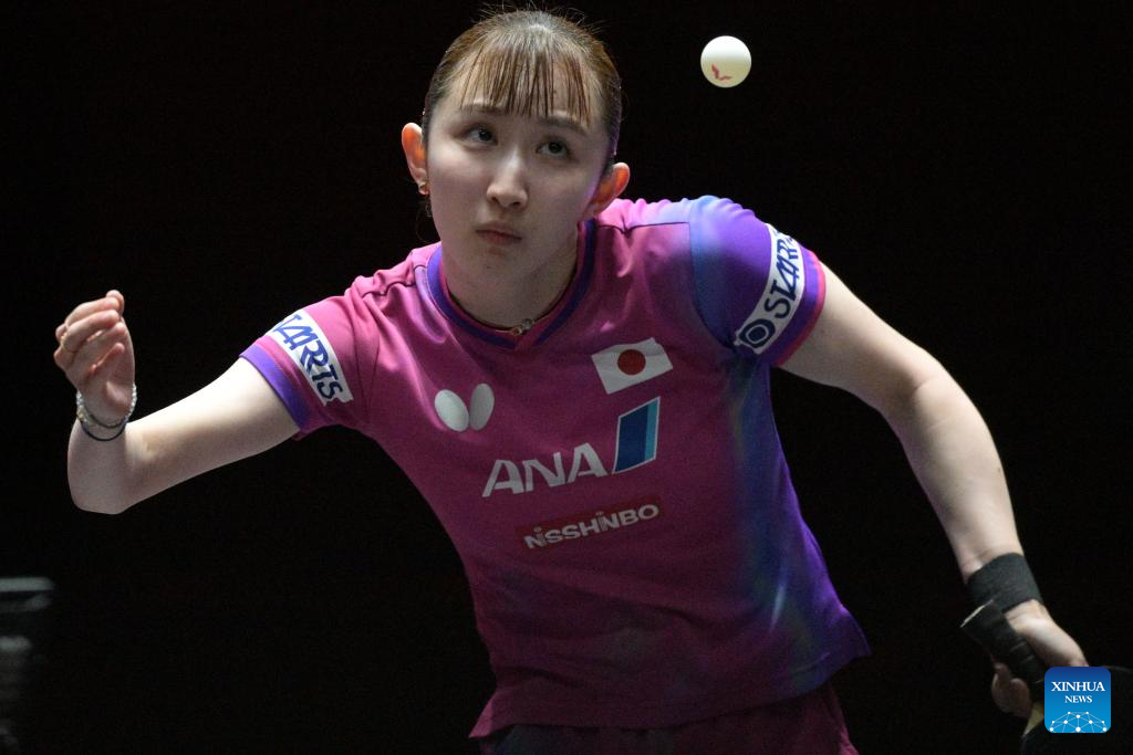 Hayata Hina hits a return during the women's singles quarterfinal between Sun Yingsha of China and Hayata Hina of Japan at the World Table Tennis (WTT) Singapore Smash 2026 in Singapore on Feb. 28, 2026. (Photo by Then Chih Wey/Xinhua)