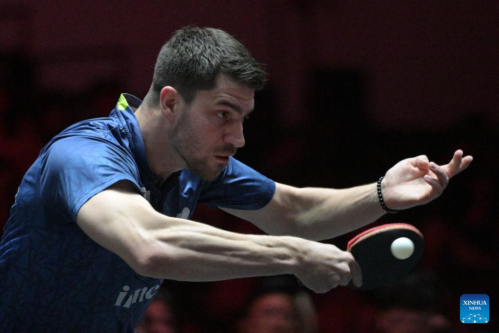 Patrick Franziska hits a return during the men's singles quarterfinal between Lin Yun-Ju of Chinese Taipei and Patrick Franziska of Germany at the World Table Tennis (WTT) Singapore Smash 2026 in Singapore on Feb. 28, 2026. (Photo by Then Chih Wey/Xinhua)