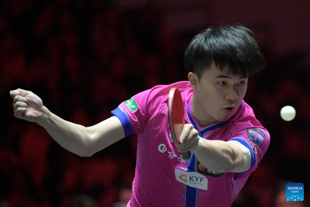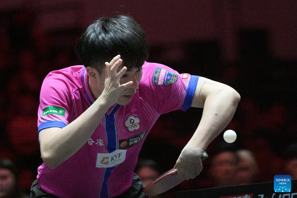 Lin Yun-Ju hits a return during the men's singles quarterfinal between Lin Yun-Ju of Chinese Taipei and Patrick Franziska of Germany at the World Table Tennis (WTT) Singapore Smash 2026 in Singapore on Feb. 28, 2026. (Photo by Then Chih Wey/Xinhua)