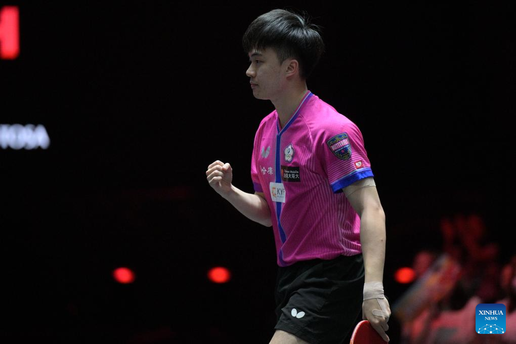 Lin Yun-Ju reacts during the men's singles quarterfinal between Lin Yun-Ju of Chinese Taipei and Patrick Franziska of Germany at the World Table Tennis (WTT) Singapore Smash 2026 in Singapore on Feb. 28, 2026. (Photo by Then Chih Wey/Xinhua)