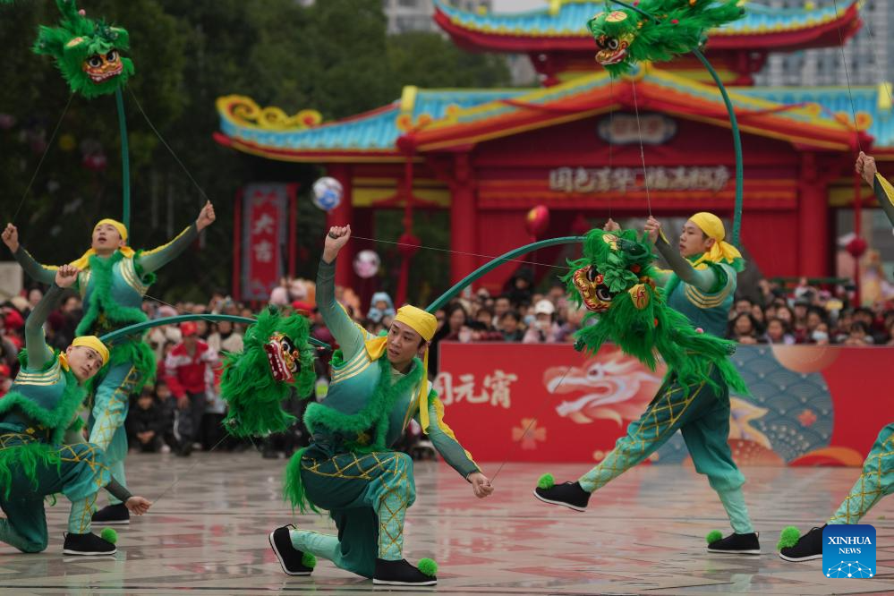 Folk artists perform a lion dance in celebration of the upcoming Lantern Festival in Tonglu County, east China's Zhejiang Province, Feb. 28, 2026. The Lantern Festival falls on the fifteenth day of the first month of the traditional Chinese calendar, or March 3 this year. (Xinhua/Huang Zongzhi)