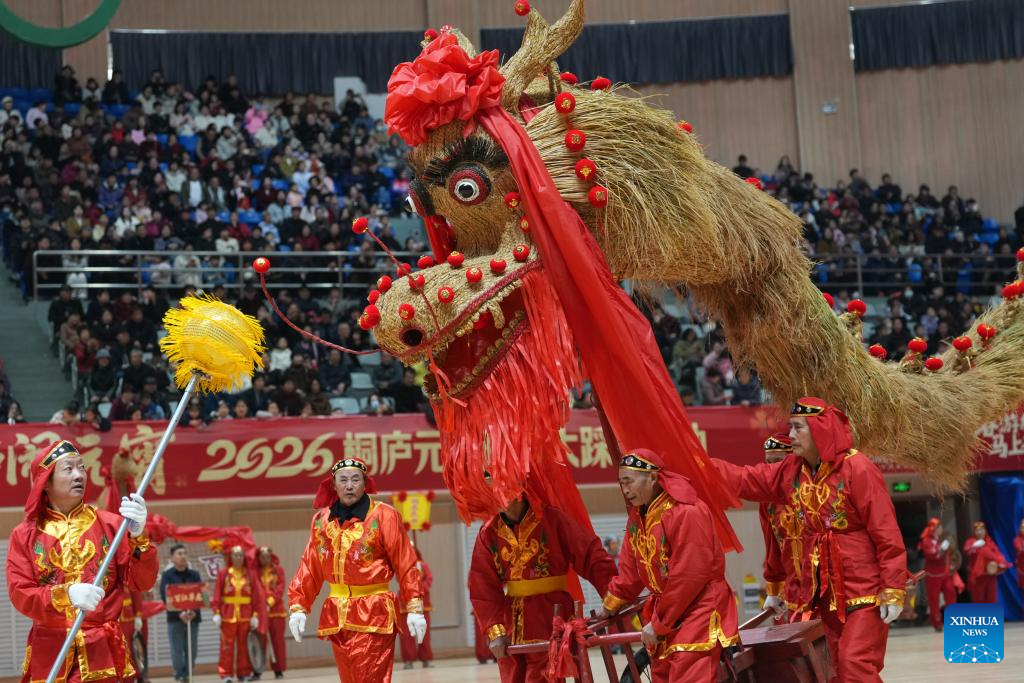 Folk artists perform a dragon dance in celebration of the upcoming Lantern Festival in Tonglu County, east China's Zhejiang Province, Feb. 28, 2026. The Lantern Festival falls on the fifteenth day of the first month of the traditional Chinese calendar, or March 3 this year. (Xinhua/Huang Zongzhi)