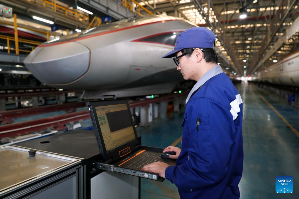 A mechanic checks wheels of an electric multiple unit (EMU) with an smart ultrasonic flaw detector at an EMU depot of Shanghai EMU Section in Shanghai, east China, Feb. 28, 2026. The China Railway Shanghai Group Co., Ltd. has deployed a variety of cutting-edge high-tech gears during this year's Spring Festival travel rush to further empower its staff members in rail inspection, vehicle maintenance and other missions to safeguard passengers on their way. (Xinhua/Wang Xiang)