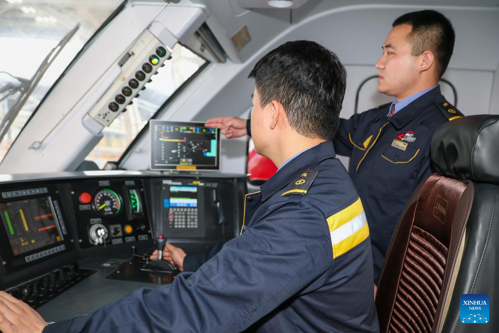 Train drivers check the shunting error prevention system at a maintenance field of the Shanghai Locomotive & Rolling Stock Section of the China Railway Shanghai Group Co., Ltd., in Shanghai, east China, Feb. 28, 2026. The China Railway Shanghai Group Co., Ltd. has deployed a variety of cutting-edge high-tech gears during this year's Spring Festival travel rush to further empower its staff members in rail inspection, vehicle maintenance and other missions to safeguard passengers on their way. (Xinhua/Wang Xiang)