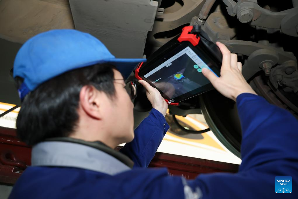 A mechanic tries to locate gas leakage in the air ducts of the brake cylinders of electric multiple units (EMUs) with a smart multi-functional acoustic imaging device at an EMU depot of the Shanghai EMU Section of China Railway Shanghai Group Co., Ltd., in Shanghai, east China, Feb. 28, 2026. The China Railway Shanghai Group Co., Ltd. has deployed a variety of cutting-edge high-tech gears during this year's Spring Festival travel rush to further empower its staff members in rail inspection, vehicle maintenance and other missions to safeguard passengers on their way. (Xinhua/Wang Xiang)