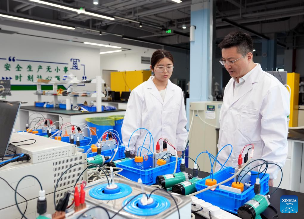 Zhang Fan (R) communicates with an engineer at a research base of China Electrical Equipment Group in Shanghai, east China, Jan. 27, 2026. (Xinhua/Liu Ying)