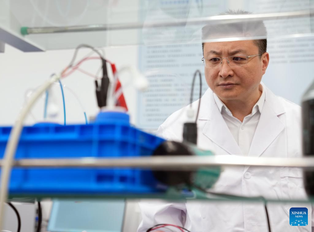 Zhang Fan observes an experiment at a laboratory of an electrical equipment company of China Electrical Equipment Group in Jinan, east China's Shandong Province, Feb. 13, 2026. (China Electrical Equipment Group/Handout via Xinhua)