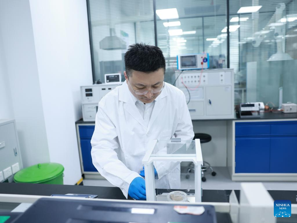 Zhang Fan introduces insulating cardboard, a key material for ultra-high voltage transformers, at a research base of China Electrical Equipment Group in Shanghai, east China, Jan. 27, 2026. (Xinhua/Liu Ying)