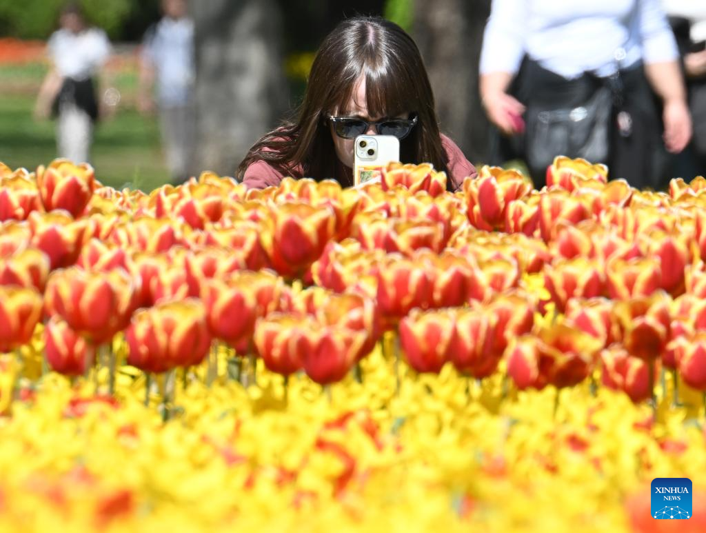 People enjoy blooming flowers at a park in Valeggio sul Mincio, Verona, Italy, April 4, 2026. (Photo by Alberto Lingria/Xinhua)