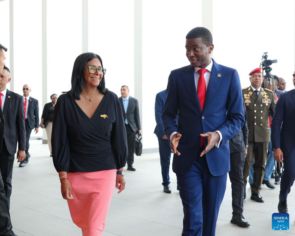 Venezuela's Acting President Delcy Rodriguez (L, front) talks with Grenadian Prime Minister Dickon Mitchell (R, front) during her official visit, in St. George's, Grenada, on April 9, 2026. Delcy Rodriguez arrived in Grenada on Thursday for an official visit aimed at strengthening bilateral cooperation between the two countries. The visit marks her first trip abroad since assuming her role as the acting president in January. (Venezuelan Presidency/Handout via Xinhua)