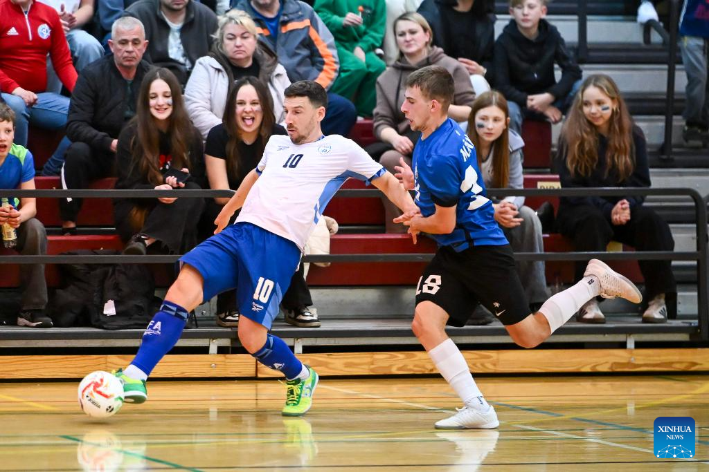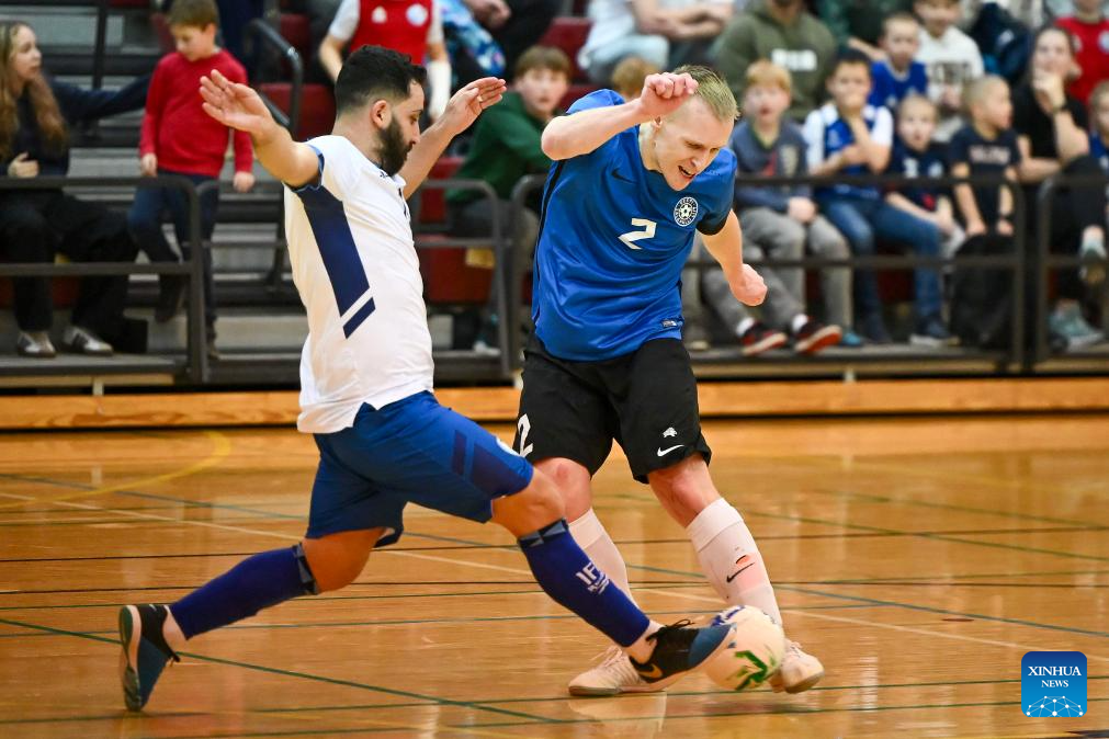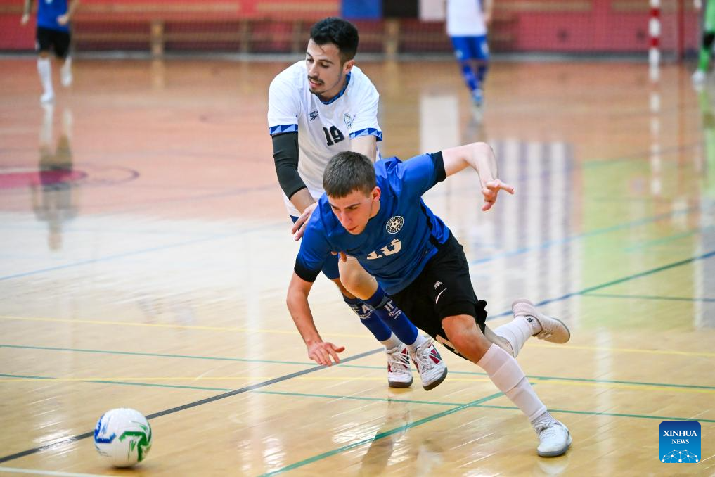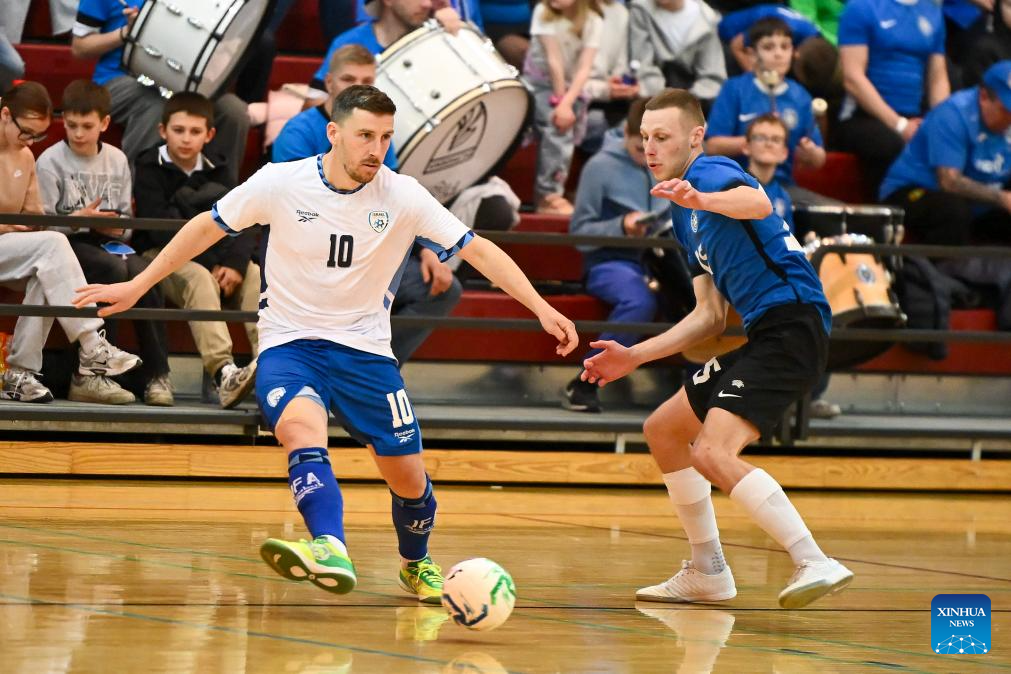 Raul Manni (R) of Estonia vies with Yotam Yehezkel Hadad of Israel during the 2028 FIFA Futsal World Cup preliminary round football match between Estonia and Israel in Johvi, Estonia, on April 12, 2026. (Photo by Sergei Stepanov/Xinhua)