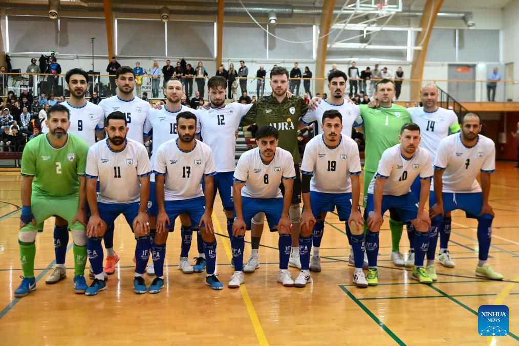 Players of Israel pose before the 2028 FIFA Futsal World Cup preliminary round football match between Estonia and Israel in Johvi, Estonia, on April 12, 2026. (Photo by Sergei Stepanov/Xinhua)