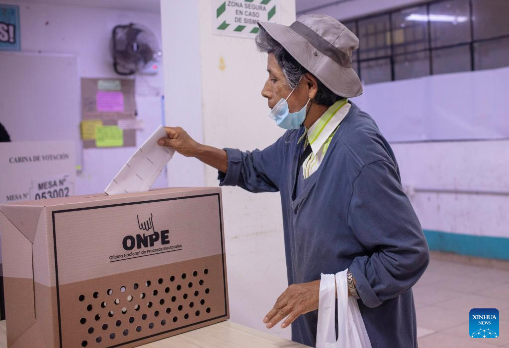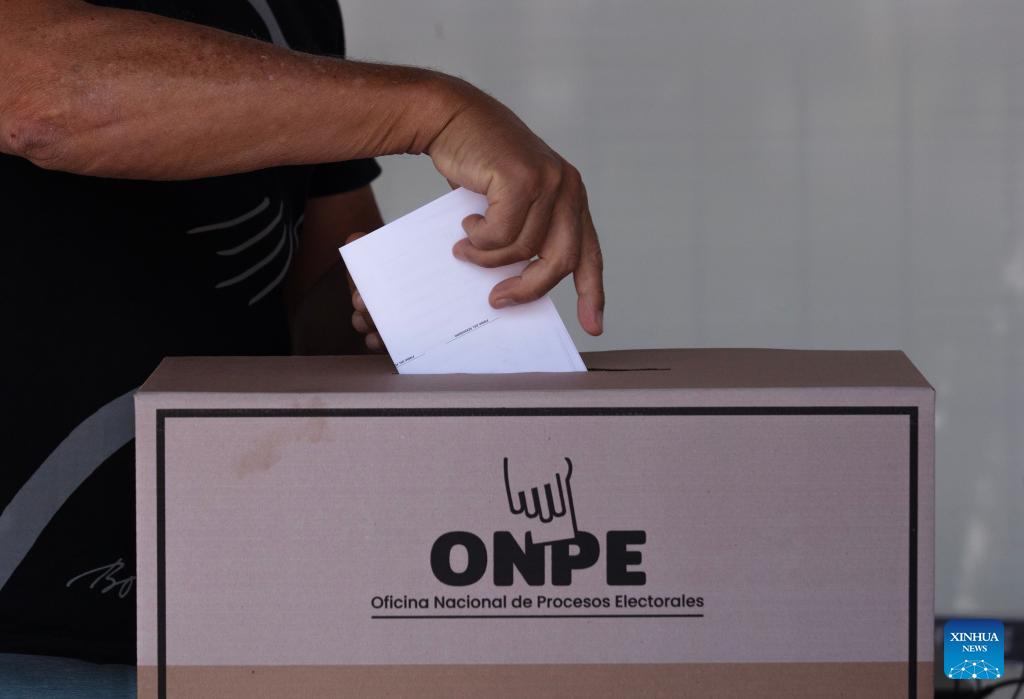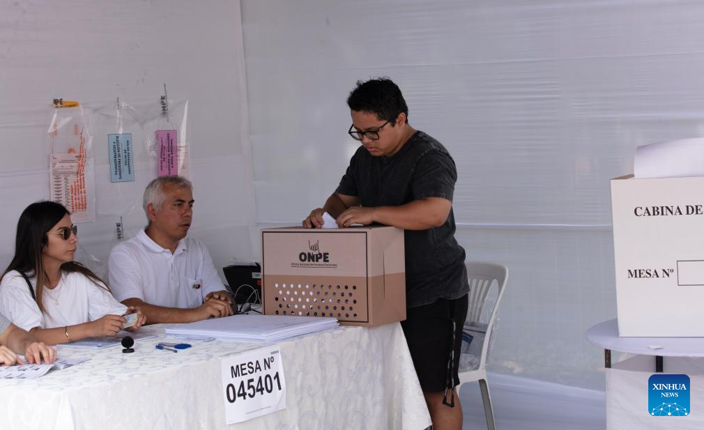 A voter casts a ballot at a polling station in Lima, Peru, April 12, 2026. Peruvian President Jose Balcazar on Sunday urged citizens to vote with "calm and serenity" as the country holds general elections to choose a new president and members of a bicameral Congress.