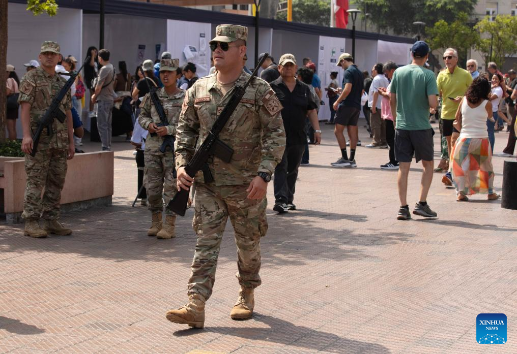 Soldiers stand guard at a polling station in Lima, Peru, April 12, 2026. Peruvian President Jose Balcazar on Sunday urged citizens to vote with "calm and serenity" as the country holds general elections to choose a new president and members of a bicameral Congress.
