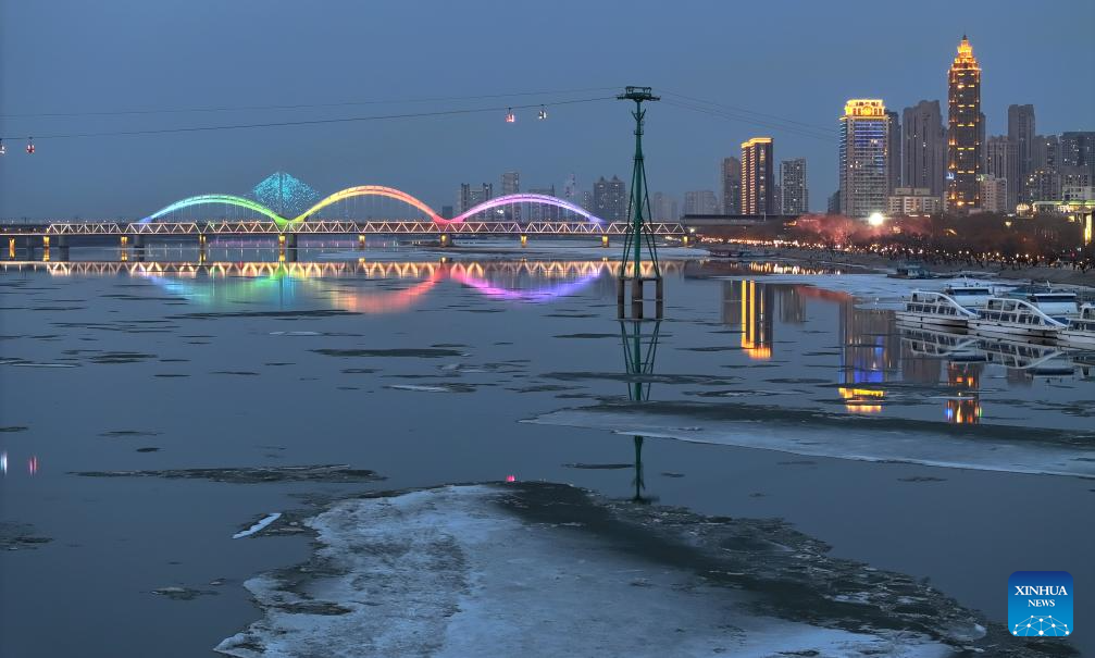 A drone photo taken on April 9, 2026 shows a view of drift ice floating on the Harbin section of Songhua River in northeast China's Heilongjiang Province. Large amount of ice drifted on the surface of Heilongjiang River and Songhua River recently due to the rise of temperature. (Photo by Zhang Shu/Xinhua)