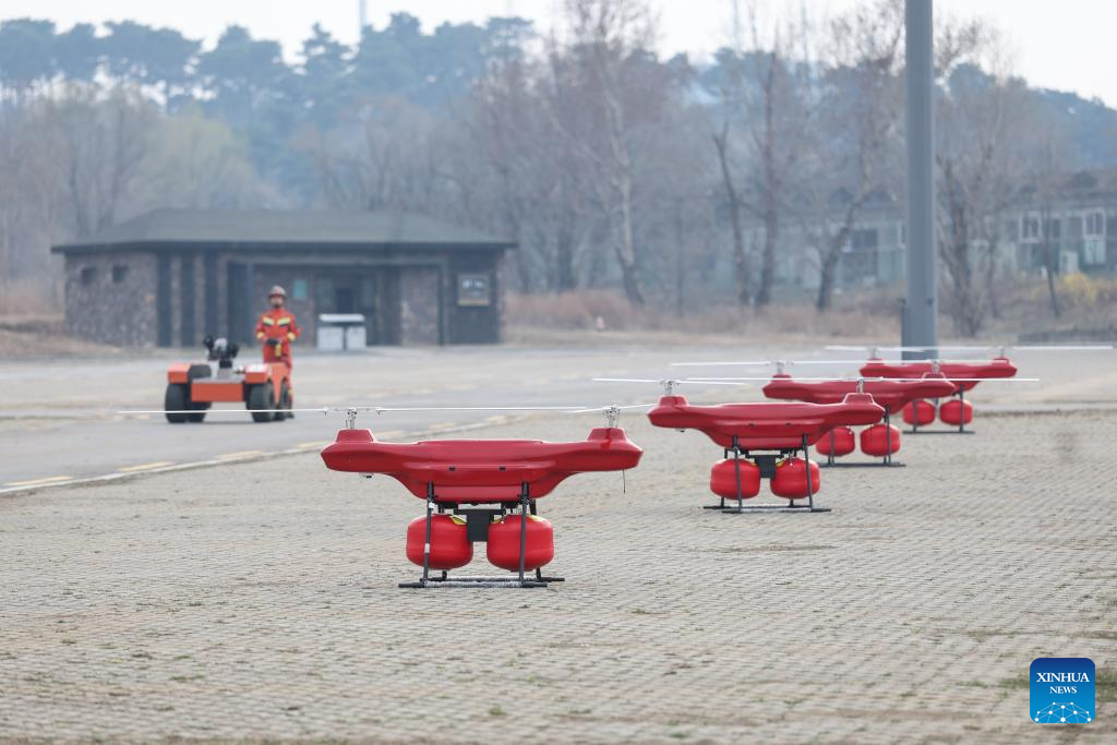Fire extinguishing drones are seen during a fire drill in Shenyang, northeast China's Liaoning Province, April 14, 2026. The drill was conducted on Tuesday to enhance the local emergency workers' preparedness for forest fires, which are prone in spring. (Xinhua/Pan Yulong)