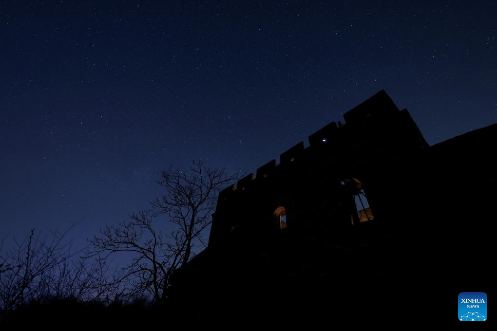 This photo taken on April 15, 2026 shows a view of the starry sky above the Jinshanling section of the Great Wall in Chengde City, north China's Hebei Province. (Photo by Wang Junfeng/Xinhua)