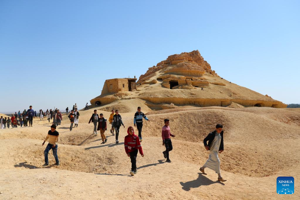 People visit the Mountain of the Dead at Siwa Oasis in Matrouh Governorate, Egypt, on March 26, 2022. Siwa Oasis, in Egypt's Western Desert, is a renowned tourist destination in Egypt for its natural landscapes, historical ruins and cultural traditions. (Xinhua/Sui Xiankai)