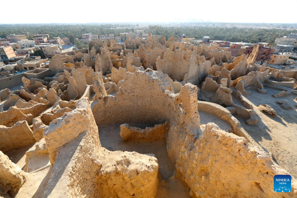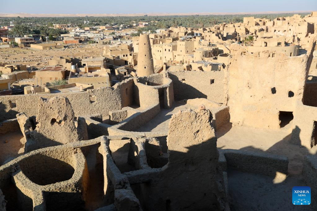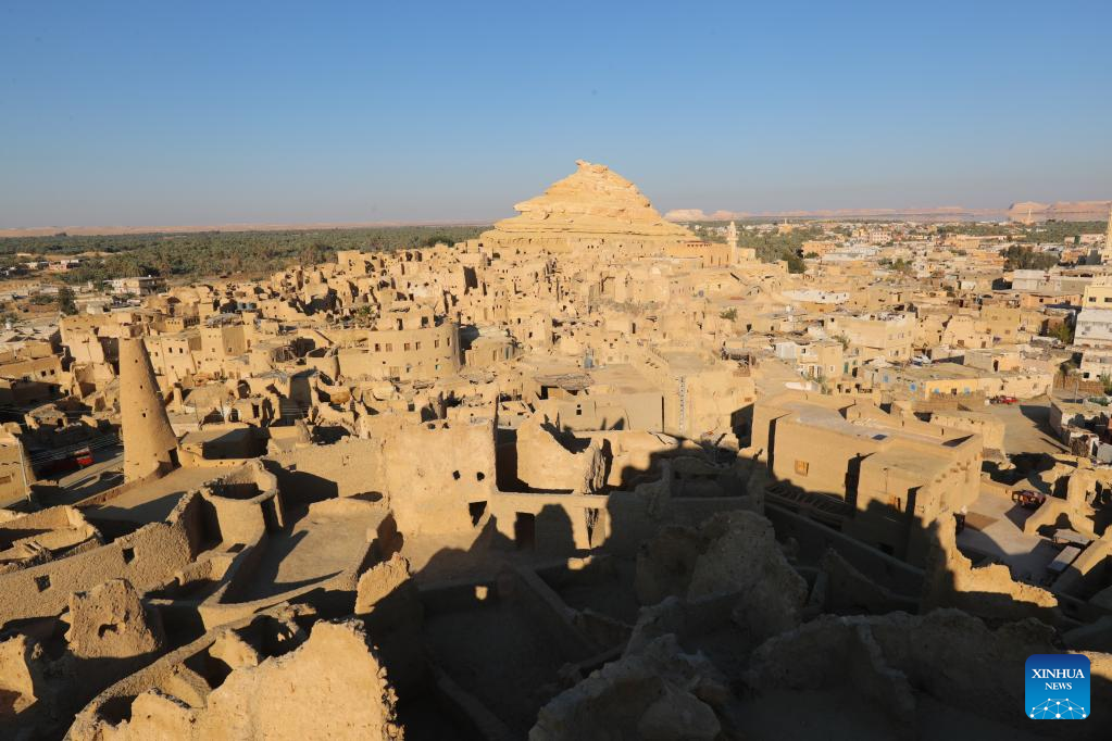 Photo taken on March 26, 2022 shows a view of the ruins of Shali Fortress at Siwa Oasis in Matrouh Governorate, Egypt. Siwa Oasis, in Egypt's Western Desert, is a renowned tourist destination in Egypt for its natural landscapes, historical ruins and cultural traditions. (Xinhua/Sui Xiankai)