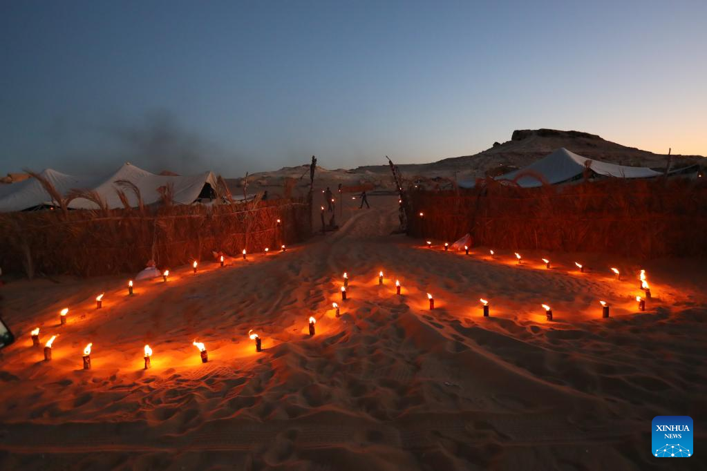 Photo taken on March 25, 2022 shows the entrance to a desert camp site around Siwa Oasis in Matrouh Governorate, Egypt. Siwa Oasis, in Egypt's Western Desert, is a renowned tourist destination in Egypt for its natural landscapes, historical ruins and cultural traditions. (Xinhua/Sui Xiankai)