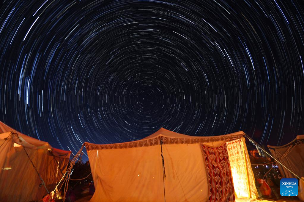 Photomontage taken on March 25, 2022 shows the star trails over the desert around Siwa Oasis in Matrouh Governorate, Egypt. Siwa Oasis, in Egypt's Western Desert, is a renowned tourist destination in Egypt for its natural landscapes, historical ruins and cultural traditions. (Xinhua/Sui Xiankai)