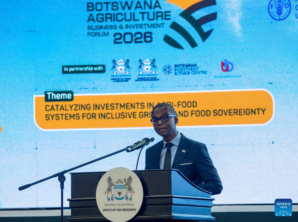 Botswana's Vice President and Minister of Finance Ndaba Gaolathe speaks at the Botswana Agriculture Business and Investment Forum held in Tlokweng, on the outskirts of Gaborone, Botswana, Feb. 26, 2026. Gaolathe emphasized on Thursday the need for greater investment in the southern African country's agricultural sector to reposition it as a central driver of economic diversification. (Photo by Tshekiso Tebalo/Xinhua)
