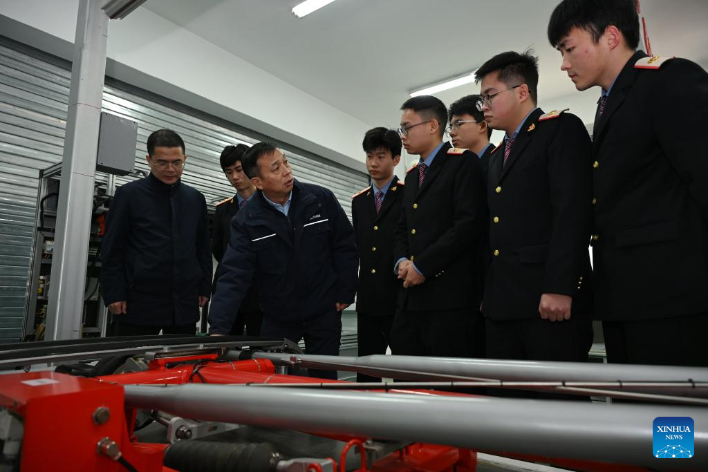 Dong Hongtao (1st R) communicates with students in Shaanxi Railway Institute in Weinan City, northwest China's Shaanxi Province, Feb. 4, 2026. (Xinhua/Li Yibo)