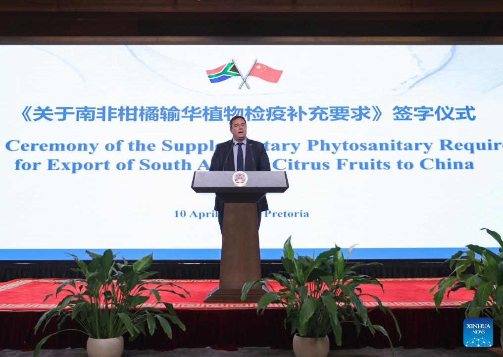JOHANNESBURG, April 10 (Xinhua) -- South African Minister of Agriculture John Steenhuisen on Friday welcomed the amendment of cold treatment requirements regulating the export of South African citrus to China, saying the move will help expand trade opportunities and deepen bilateral agricultural cooperation.