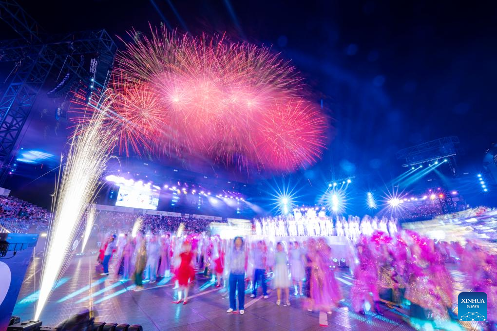 Fireworks light up the sky during the Chingay Parade as part of the Lunar New Year celebrations in Singapore on Feb. 27, 2026. (Photo by Then Chih Wey/Xinhua)