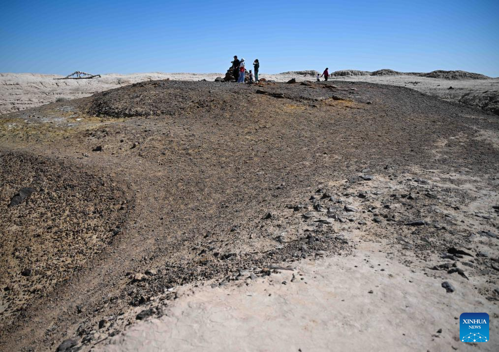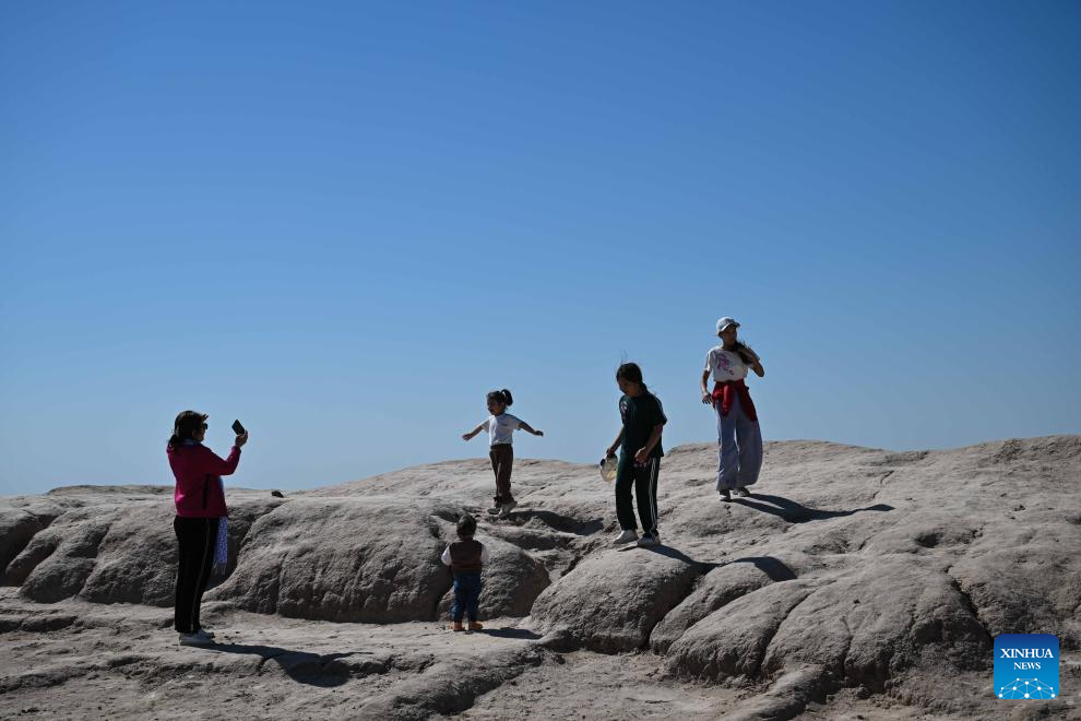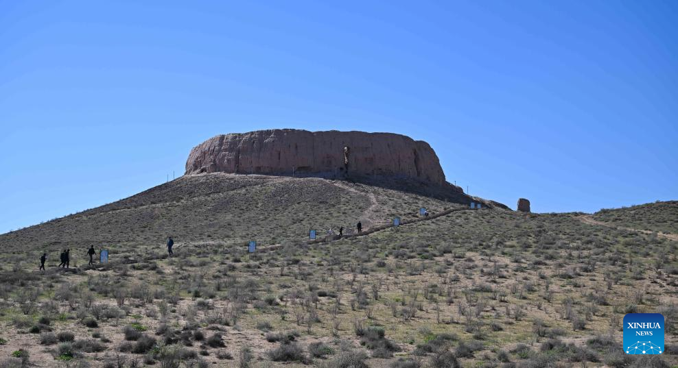 People visit the Chilpik monument near Nukus, Uzbekistan, on April 11, 2026. Located more than 40 kilometers south of Nukus, the capital of the Republic of Karakalpakstan in Uzbekistan, the Chilpik monument was an ancient Zoroastrian archaeological site and later served as a signal tower. Nowadays, It becomes one of the region's key cultural symbols and attracts crowds of visitors from home and abroad. (Xinhua/Li Renzi)