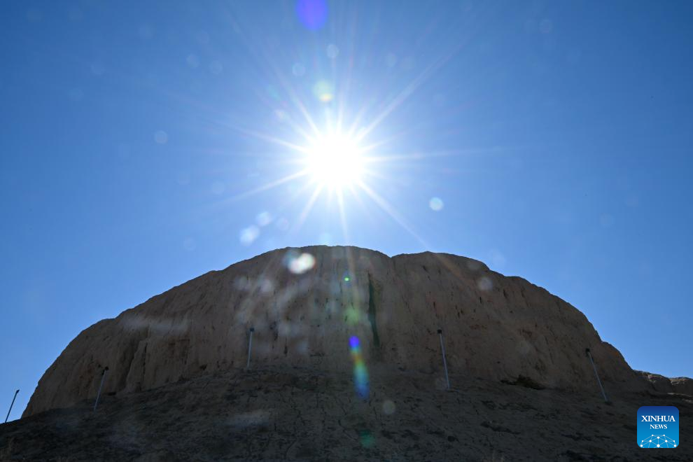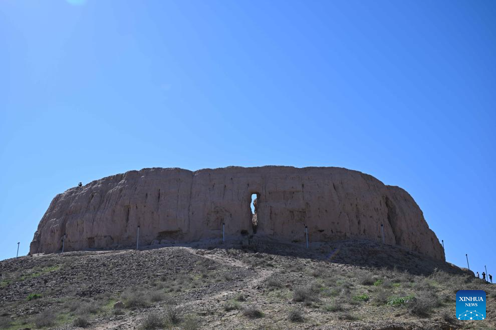 This photo taken on April 11, 2026 shows the Chilpik monument near Nukus, Uzbekistan. Located more than 40 kilometers south of Nukus, the capital of the Republic of Karakalpakstan in Uzbekistan, the Chilpik monument was an ancient Zoroastrian archaeological site and later served as a signal tower. Nowadays, It becomes one of the region's key cultural symbols and attracts crowds of visitors from home and abroad. (Xinhua/Li Renzi)
