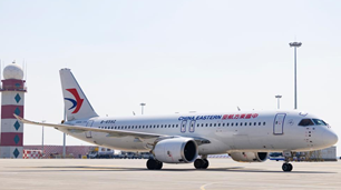 C919 jetliner lands at Harbin Taiping Int'l Airport in NE China