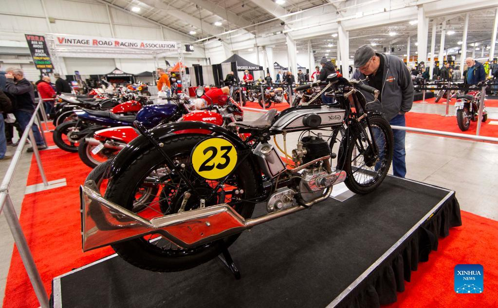 A man looks at a vintage motorcycle during the 2022 North American International Motorcycle Supershow in Mississauga, the Greater Toronto Area, Canada, on March 25, 2022. The three-day event kicked off here on Friday with hundreds of different models of motorcycles. (Photo by Zou Zheng/Xinhua)