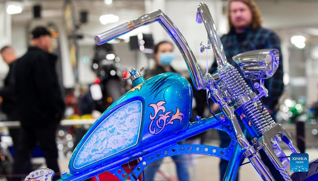 People visit the 2022 North American International Motorcycle Supershow in Mississauga, the Greater Toronto Area, Canada, on March 25, 2022. The three-day event kicked off here on Friday with hundreds of different models of motorcycles. (Photo by Zou Zheng/Xinhua)