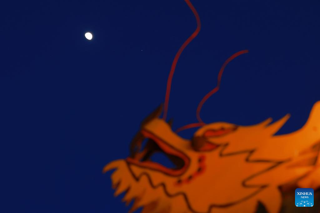 This photo taken on Feb. 27, 2026 shows the planet of Jupiter next to the moon in the sky over Qiqihar City, northeast China's Heilongjiang Province. (Photo by Wang Yonggang/Xinhua)