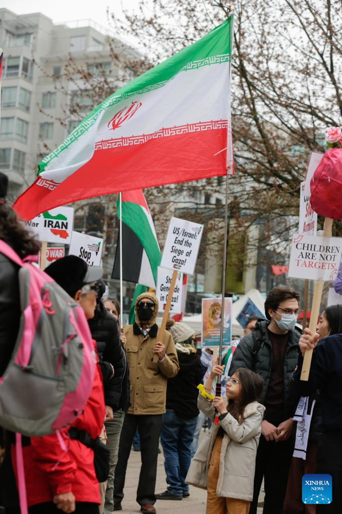 A young girl holding an Iranian flag attends an anti-war rally in Vancouver, British Columbia, Canada, on April 11, 2026. The rally was held here on Saturday, opposing U.S. and Israeli attacks on Iran, Lebanon, as well as Gaza, and calling for peace and the long-term stability of the ceasefire, and respect for human rights. (Photo by Liang Sen/Xinhua)