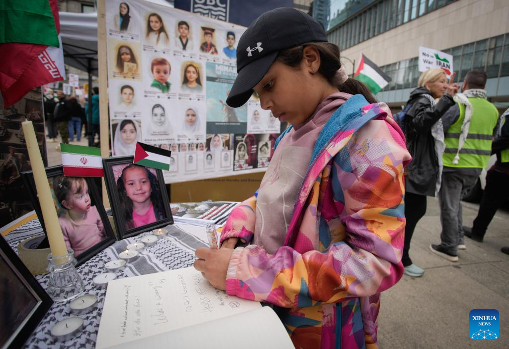 A girl leaves messages in a memorial book to commemorate children killed in U.S. and Israeli attacks during an anti-war rally in Vancouver, British Columbia, Canada, on April 11, 2026. The rally was held here on Saturday, opposing U.S. and Israeli attacks on Iran, Lebanon, as well as Gaza, and calling for peace and the long-term stability of the ceasefire, and respect for human rights. (Photo by Liang Sen/Xinhua)