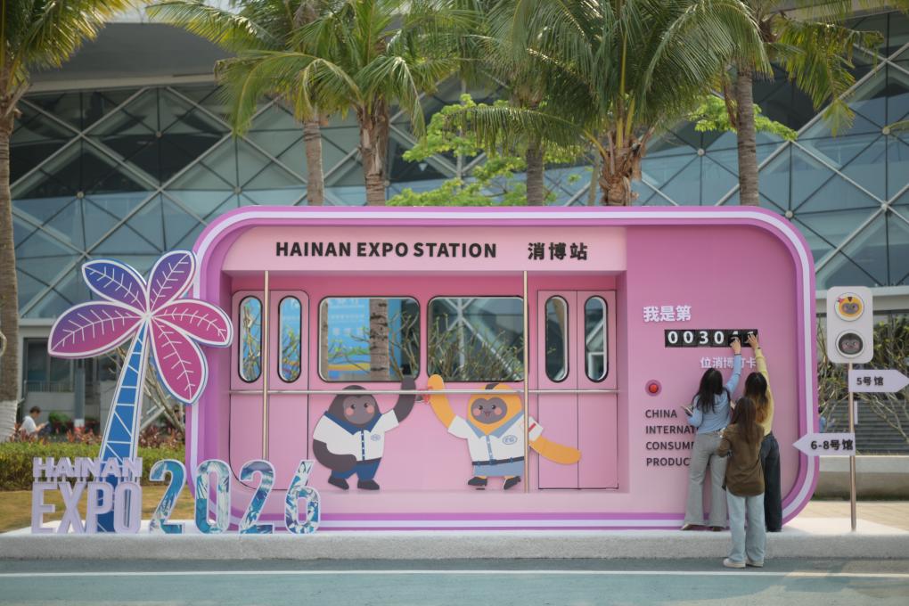 4月13日,人们在第六届消博会主会场海南国际会展中心外打卡。