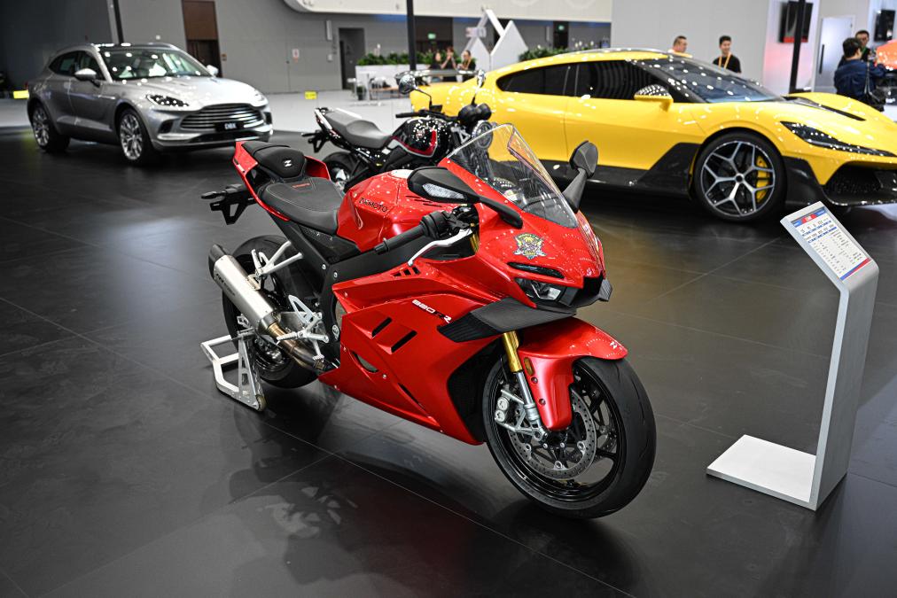 4月13日在第六届消博会主会场拍摄的一款张雪机车。