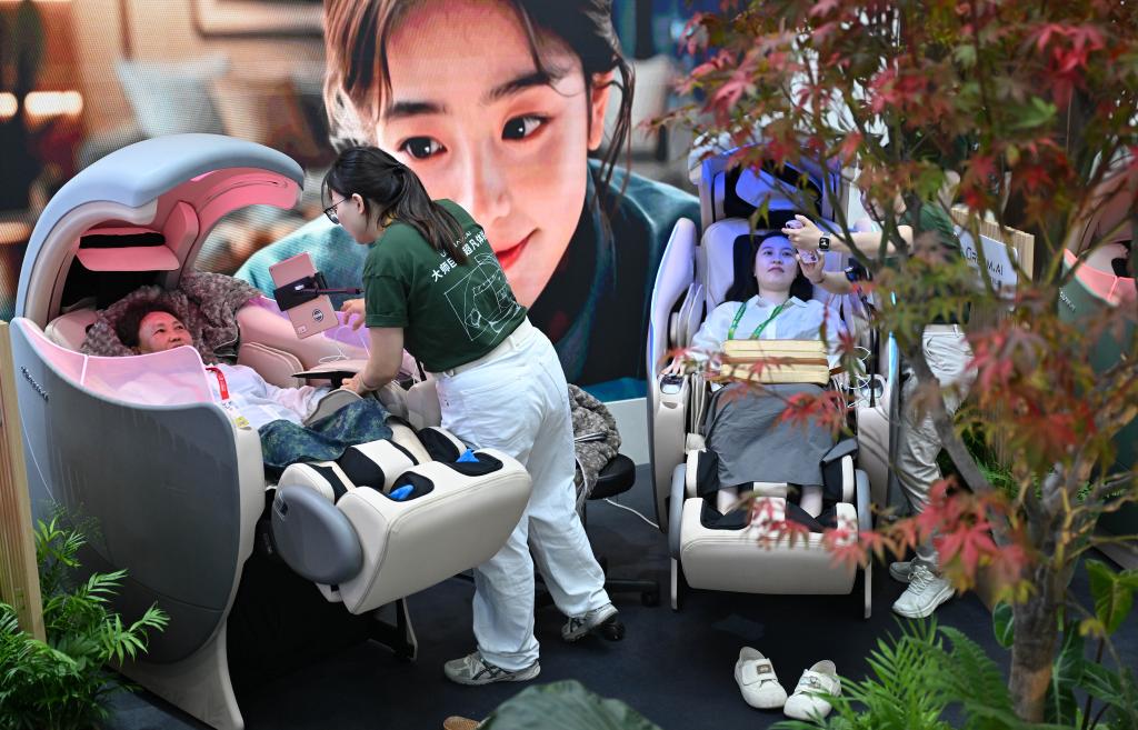 4月13日,参观者在第六届消博会现场体验按摩椅。