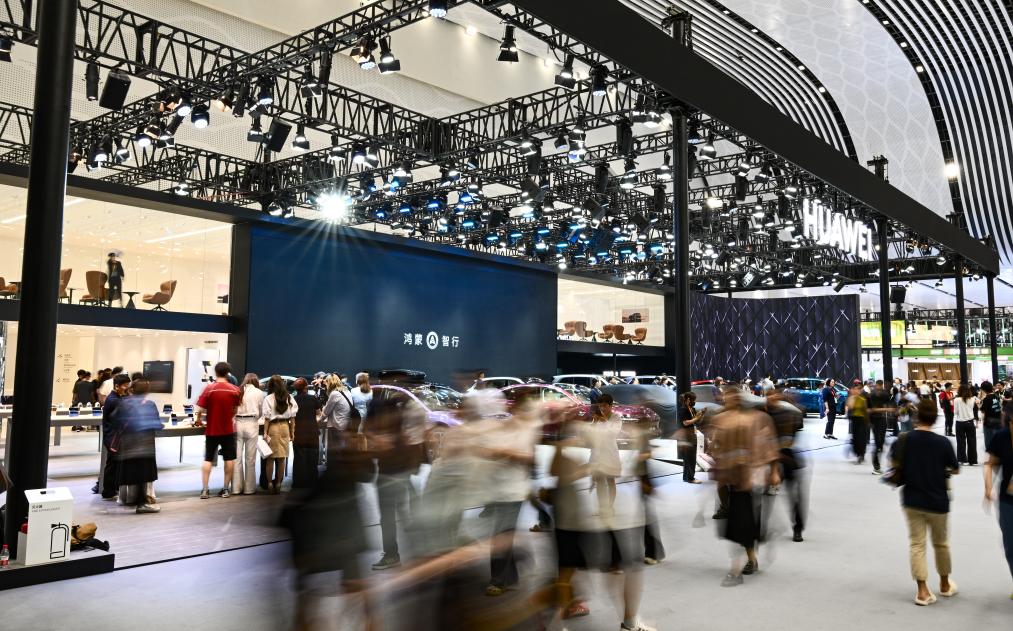 4月13日,参观者在第六届消博会主会场了解华为产品。