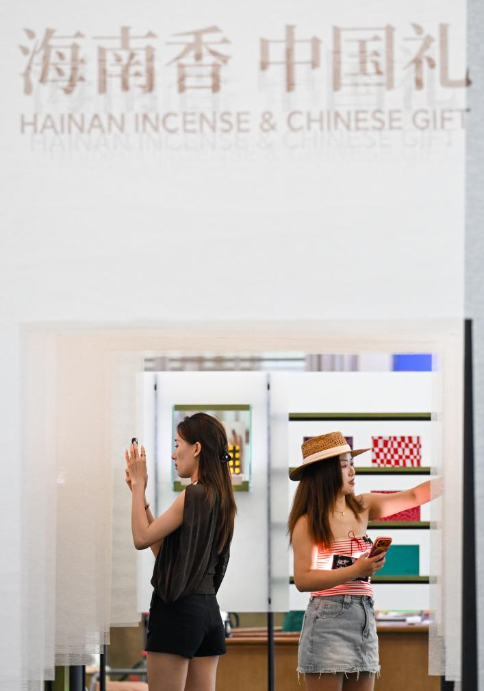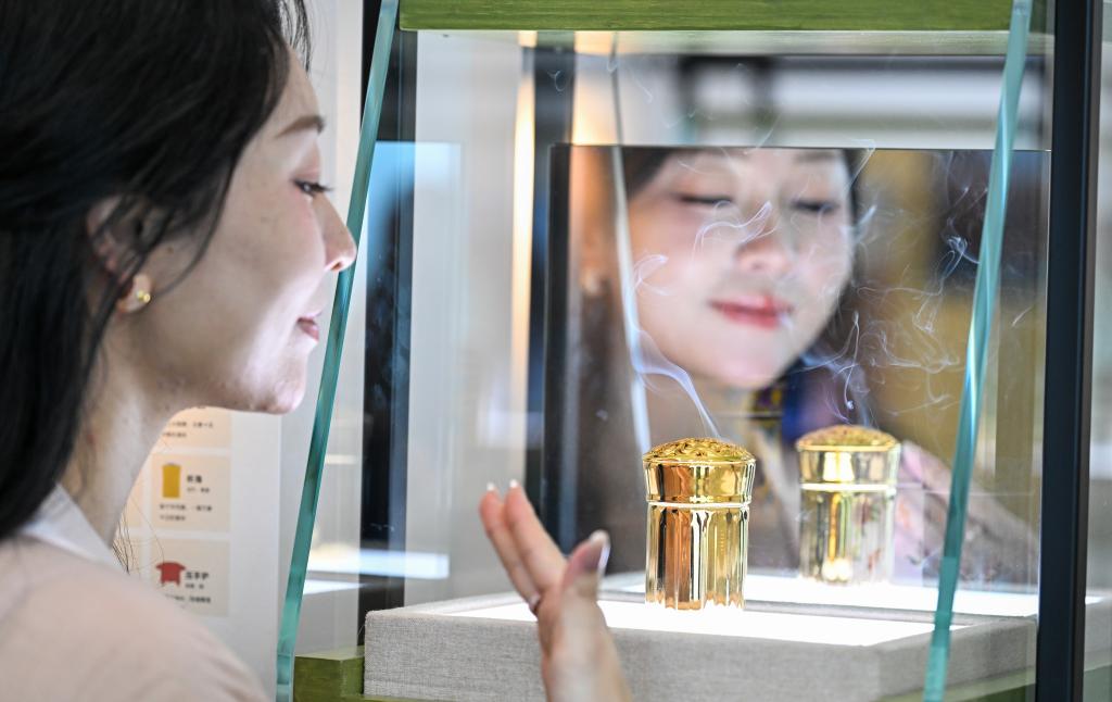4月13日,参观者在第六届消博会主会场品鉴沉香产品。