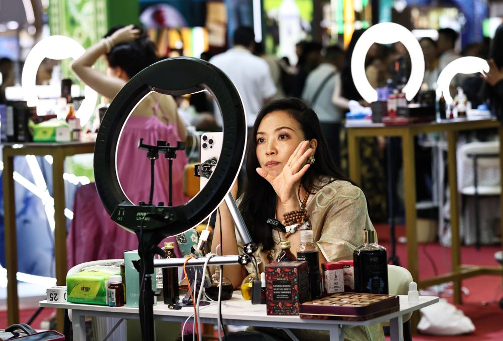 4月13日,主播在第六届消博会的一家化妆品展台直播。