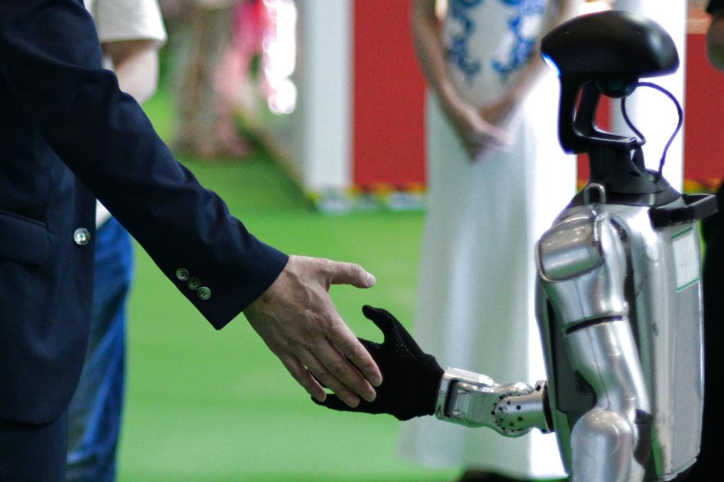 4月13日,一名男子在第六届消博会上与一款人形机器人握手。