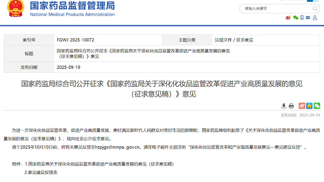 國(guó)家藥監(jiān)局綜合司公開征求《國(guó)家藥監(jiān)局關(guān)于深化化妝品監(jiān)管改革促進(jìn)產(chǎn)業(yè)高質(zhì)量發(fā)展的意見(征求意見稿)》意見