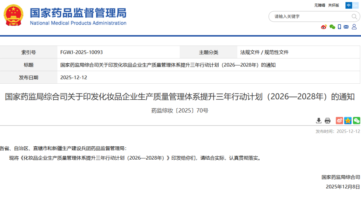 國(guó)家藥監(jiān)局綜合司關(guān)于印發(fā)化妝品企業(yè)生產(chǎn)質(zhì)量管理體系提升三年行動(dòng)計(jì)劃(2026—2028年)的通知 藥監(jiān)綜妝〔2025〕70號(hào)