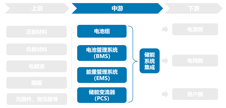 在锂电池储能的中游,需将上游的原材料整合成电池组,并集成“3S”系统等配套设备,形成完整的储能系统。