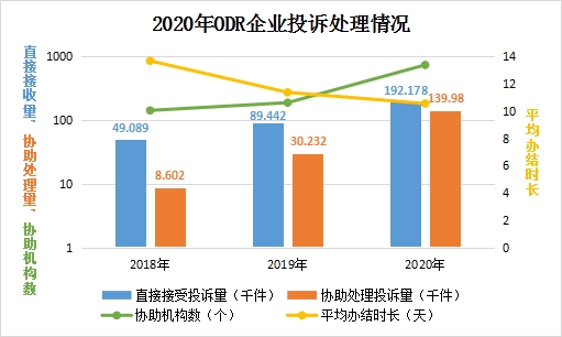 2020年,市場監(jiān)管部門大力推進(jìn)在線糾紛和解機(jī)制建設(shè),努力把消費(fèi)糾紛化解在源頭、解決在基層、和解在企業(yè)。全國12315平臺(tái)共發(fā)展ODR企業(yè)2.55萬家,主動(dòng)與消費(fèi)者協(xié)商糾紛19.22萬件,與傳統(tǒng)調(diào)解方式相比,和解率高出6.21個(gè)百分點(diǎn),平均處理時(shí)長縮短7.76天,消費(fèi)者滿意度4.07分(滿分5分),ODR城市覆蓋率由25.60%增加到91.11%。與2019年相比,2020年ODR機(jī)制運(yùn)行質(zhì)量有了明顯提高,投訴處理量、辦理效率、和解成功率、消費(fèi)者滿意度等各方面均有明顯提升,維權(quán)效能日益突顯。