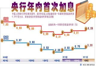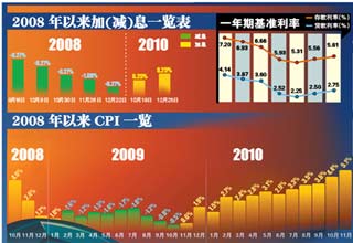 央行選取這個時點(diǎn)加息,不禁讓人聯(lián)系到統(tǒng)計局將于近日公布的1月份CPI,市場普遍預(yù)計CPI會超過5%的高點(diǎn)。專家認(rèn)為,今年央行可能還將有三至四次加息,同時還會繼續(xù)上調(diào)存款準(zhǔn)備金率。 [詳細(xì)]