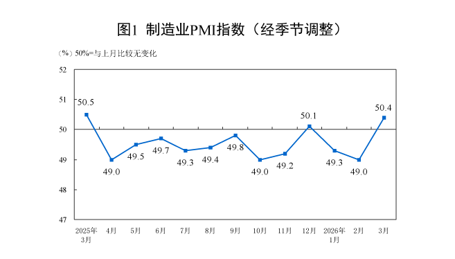 3月份,制造业采购经理指数(PMI)为50.4%,比上月上升1.4个百分点,高于临界点,制造业景气水平回升。